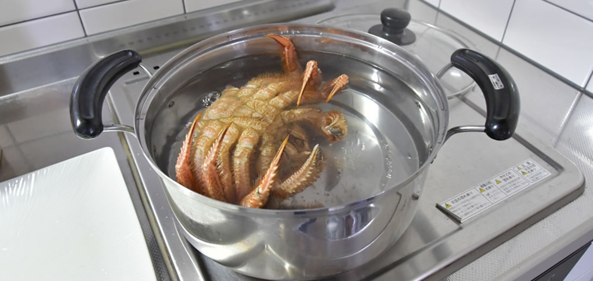 • 毛ガニ:カニ味噌を守るため、甲羅を下にして茹でる